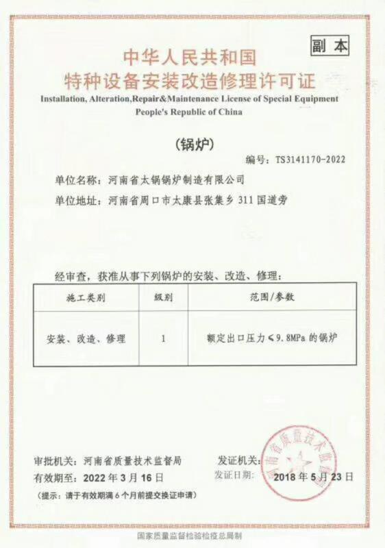 河南省太鍋鍋爐制造有限公司(原河南省太康鍋爐廠始建于1976年)始建于70年代初,經(jīng)40多年的艱辛探索,靠科技興業(yè),走科學管理之路,現(xiàn)已發(fā)展成為承接制造、安裝、設計大、中型供熱系統(tǒng),生產(chǎn):SZS燃油燃氣蒸汽鍋爐、燃煤蒸汽鍋爐、燃油鍋爐、燃氣鍋爐、電加熱鍋爐、生物質(zhì)鍋爐、茶水鍋爐、有機熱載體鍋爐、熱風鍋爐,蒸壓釜、燃油蒸汽鍋爐、燃氣蒸汽鍋爐、燃油熱水鍋爐、燃氣熱水鍋爐并承擔安裝120噸熱水鍋爐、蒸汽鍋爐,生物質(zhì)鍋爐,加工制造一、二類蒸壓釜、壓力容器,化工機械的省一級**企業(yè)。